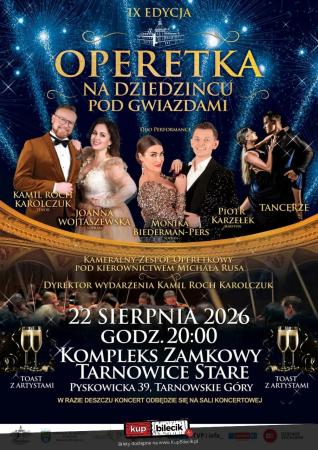 To już dziewiąty raz, gdy zapraszamy Państwa na wyjątkowe spotkanie z muzyką operetkową pod gwiazdami w magicznej scenerii dziedzińca zamku w Tarnowskich Górach. Koncert organizowany przez śpiewaków operetkowych i osobowości telewizyjne - Joannę Wojtaszewską - sopran i Kamila Rocha Karolczuka - tenor, odbył się po raz pierwszy w 2018 roku. Od tego czasu wydarzenie odbywa się corocznie, przyciągając publiczność nie tylko z całego Śląska, ale i z całej Polski, stając się nieodłącznym elementem kulturalnego kalendarza Tarnowskich Gór, Powiatu Tarnogórskiego oraz województwa śląskiego.