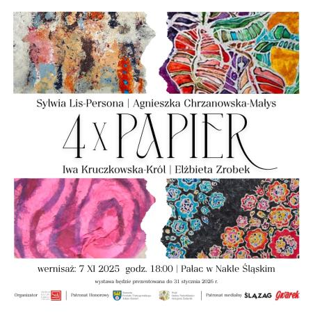 Wystawa pt: 4 x PAPIER jest prezentacją obiektów wykonanych z materii pochodzenia organicznego. W XXI wieku zdominowanym nowymi mediami, artystki przedstawiają sposoby wizualizacji własnych spostrzeżeń, przemyśleń i emocji. Nie ograniczają się jedynie do możliwości technicznych, ale przekraczają dosłowność i fizyczność uzyskanej w procesie preparowania roślinnej pulpy. Barwią, odbarwiają bądź wykorzystują naturalną kolorystykę włókna. Bazując na uzyskanym materiale tworzą fragmenty osobistych przestrzeni, nadając powstałym obiektom własny wymiar i kształt.